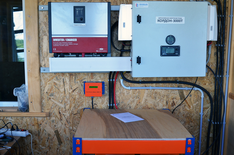 Отметим, что сердце установленной системы – чистокровный европеец TBS Powersine Combi 3500-24-70, надежный, в отличие от «европеизированных» китайцев, неприхотливый, интуитивно понятный и не требующий никаких дополнительных подстроек на месте (все необходимые параметры для конкретной системы настраиваются на производстве до отправки заказчику) Основываясь на нашем опыте, а это более сотни автономных энергосистем, установленных в разнообразных уголках нашей страны, можем однозначно заявить, что модульная солнечная электростанция КОРДОН-3000Т на базе гибридного инвертора TBS — отличный выбор для работы не только в качестве дачного резерва, но и для тяжелых заповедных условий.